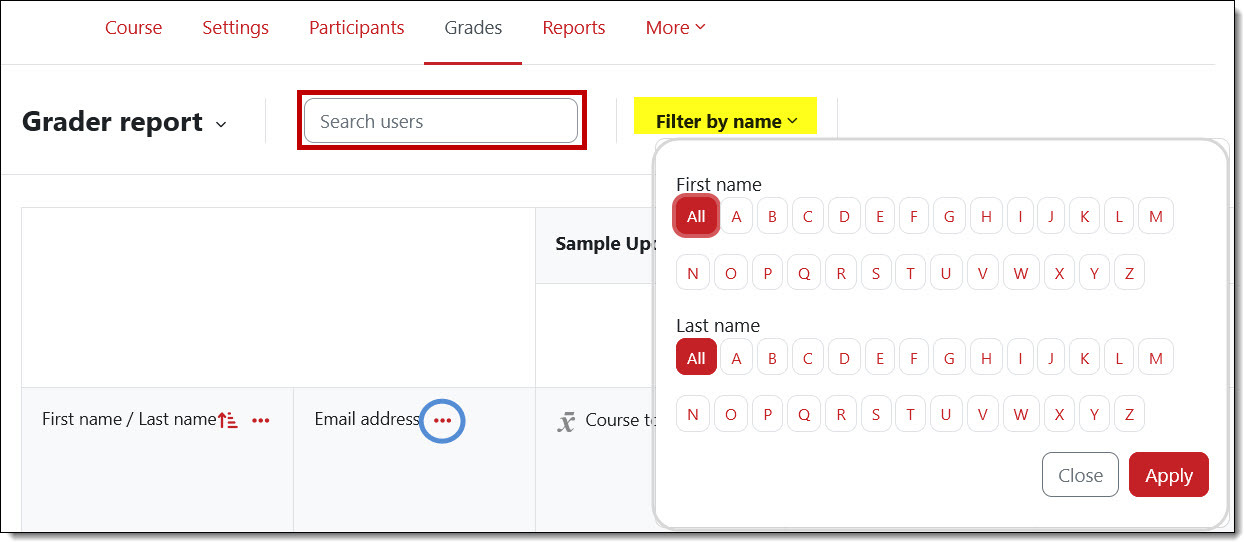 In the Grader report view, enter a name in the Search users field or filter by first or last name to review scores for a particular student.