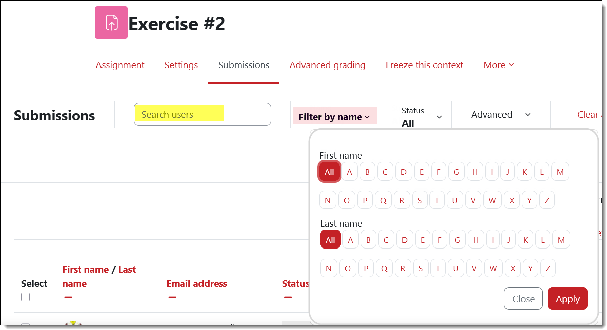 The Submissions page allows you to search for a user or filter by first or last name like the gradebook does.