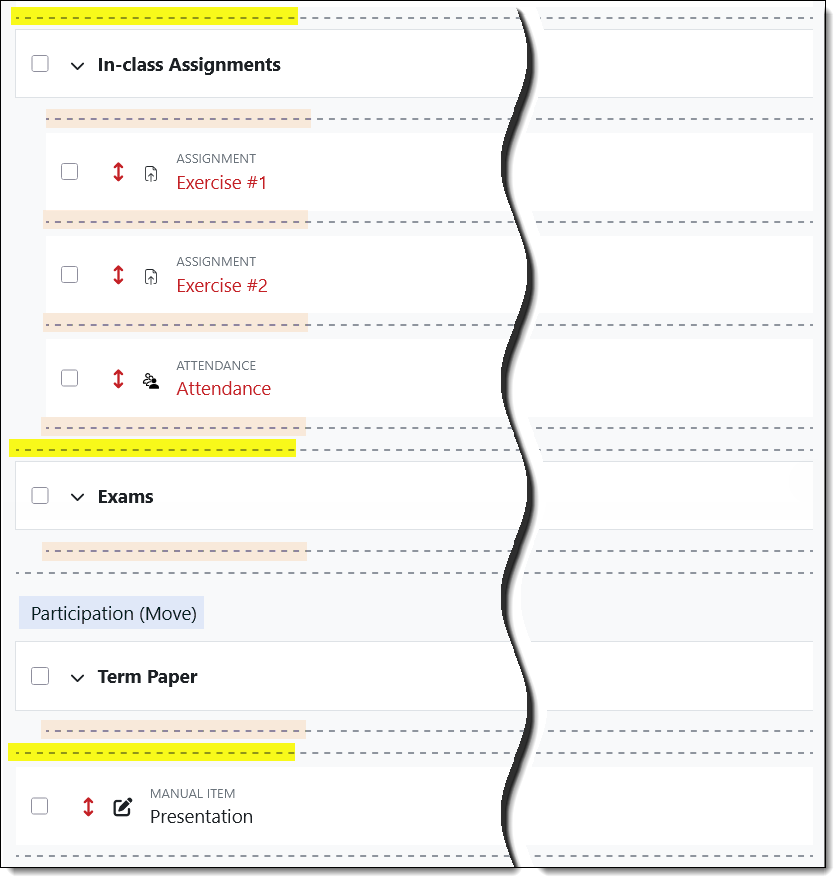 …. then click on the dotted line where you want it to reside. Be careful to choose a line that extends the entire width of the setup page (highlighted here in yellow) — if you choose a shorter, indented line (highlighted in tan), the category will become a subcategory.