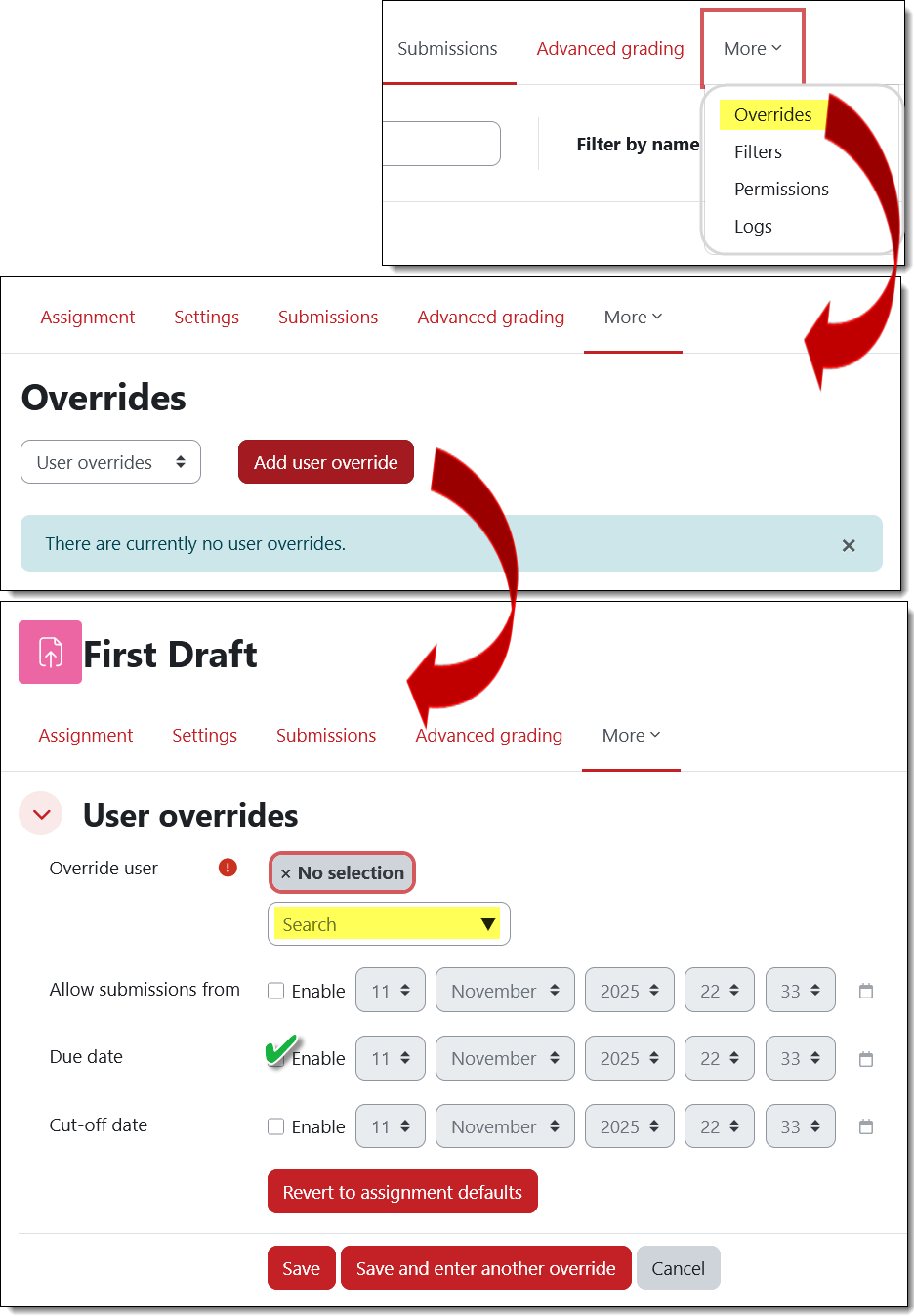 Due date overrides can be created via the assignment’s More tab. Once you have identified the student who needs an extension of the due date, enable the due date options and enter the date and time the student has been granted. (Note: You only need to enable the "Allow submissions from" option if you want to restrict students' access to the Add submission button for an assignment.)