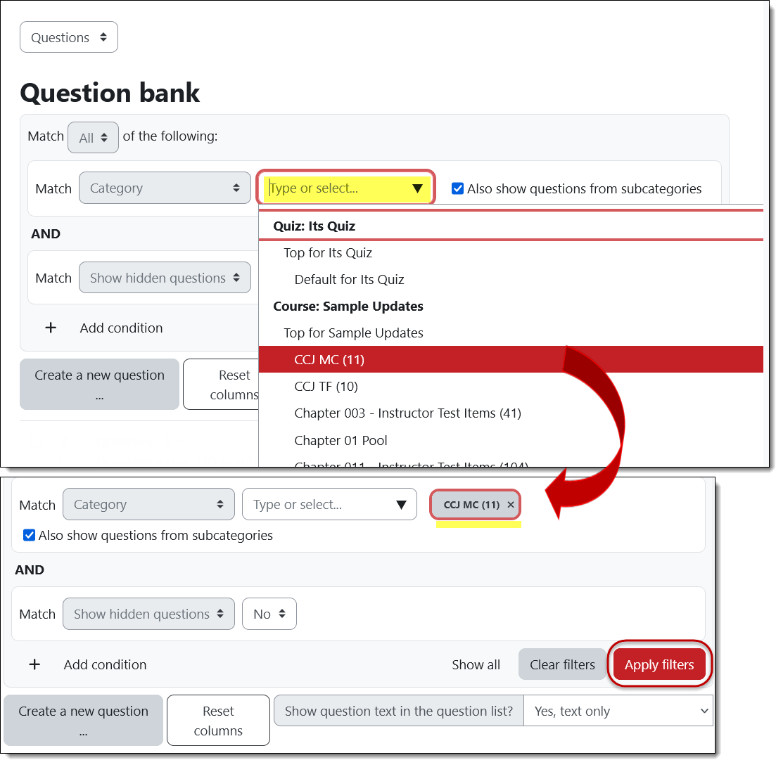 The steps involved in selecting questions in a question bank to include in a quiz have changed a bit. Instead of simply choosing a category from which to pull random questions, you now need to select the question category AND click on the Filter button to select questions.